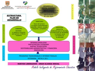 El documento presenta el plan de desarrollo del sector educativo municipal, el cual incluye estrategias, programas y una metodología de cinco pasos para construir un modelo inclusivo de mejoramiento educativo. El modelo busca mejorar la calidad, inclusión, eficiencia y gestión del servicio educativo a través de componentes como el direccionamiento estratégico, la planeación institucional, el fortalecimiento de la calidad educativa y la administración de recursos.