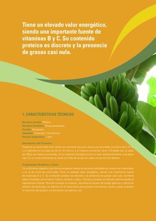 El documento proporciona información sobre la producción y comercio del banano en Perú. Resalta que Perú es el noveno exportador mundial de bananos frescos, con exportaciones valoradas en US$61 millones en 2009. El principal mercado de destino es Países Bajos, que representó el 53.6% de las exportaciones peruanas de bananos ese año. El documento también describe las principales zonas productoras de banano en Perú y las empresas exportadoras líderes.