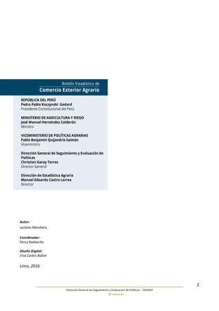 Este documento presenta estadísticas e indicadores sobre el comercio exterior agrario peruano a diciembre de 2016. La balanza comercial agraria fue positiva en USD 1,366 millones, un 13% mayor que en 2015. Las exportaciones agrarias aumentaron 10% a USD 5,790 millones, lideradas por café, uvas frescas y espárragos. Las importaciones crecieron 8% a USD 4,424 millones, con trigo, maíz y soya como principales productos. Estados Unidos fue el principal destino de exportaciones y origen de