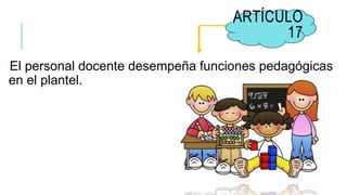 El documento describe las funciones y responsabilidades del personal docente en una escuela. Enumera los nombres de cuatro miembros del personal docente y establece que su función principal es desempeñar tareas pedagógicas. A continuación, detalla las obligaciones del personal docente, que incluyen responsabilizarse de la formación integral de los alumnos, elaborar un plan de trabajo anual, adecuar las tareas a los estudiantes y participar en reuniones y consejos. También deben cuidar la disciplina, asistir puntualmente y abstenerse de dar cl