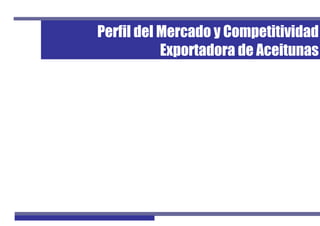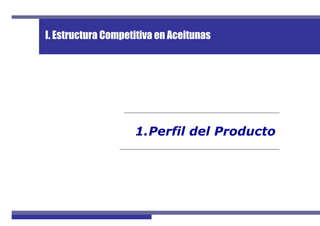 El documento describe la estructura competitiva de la industria de aceitunas en Perú. Explica las variedades de aceitunas cultivadas, los tipos, preparaciones y presentaciones comerciales. Además, analiza la cadena productiva, perfil de los agricultores, tendencias de producción a nivel nacional y departamental, y rendimientos. Finalmente, resume el proceso productivo y comercialización de la aceituna.