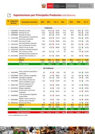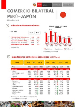El documento presenta información sobre el comercio bilateral entre Perú y Japón en 2016. Las exportaciones peruanas a Japón alcanzaron un valor de US$1,117 millones, un descenso del 29.5% respecto al año anterior. Dentro de las exportaciones tradicionales, el sector minero representó el mayor valor con US$986 millones, mientras que las exportaciones no tradicionales alcanzaron US$133 millones, un aumento del 17%. El documento también incluye detalles sobre los principales productos de exportación e importación entre ambos países.