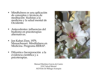 El documento trata sobre mindfulness. Explica que mindfulness es la aplicación de conceptos y técnicas de meditación budistas a la medicina y salud mental occidental. Señala que Jon Kabat-Zinn introdujo mindfulness en medicina en 1979 a través de su programa REBAP. También describe algunas técnicas básicas de mindfulness como la respiración consciente y la exploración corporal.