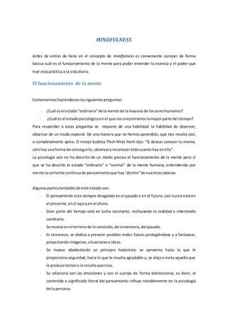 La práctica de mindfulness tiene sus orígenes en el budismo y consiste en prestar atención plena e intencional al momento presente de forma no conceptual y sin juicios. El documento describe el funcionamiento habitual de la mente humana y cómo la práctica de mindfulness a través de ejercicios como centrarse en la respiración puede ayudar a desarrollar la habilidad de mantener la atención en el presente. Finalmente, señala diversos beneficios de la práctica de mindfulness para la salud física y mental apoyados por investig
