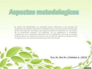 El documento habla sobre mindfulness. Explica que se originó de técnicas de meditación budistas como Vipassana y meditación Zen. Aunque originalmente estaba asociado con la meditación, ahora mindfulness también se refiere a un estado mental de atención abierta y receptiva al momento presente. Identifica varios componentes de mindfulness como la atención sostenida y el cambio atencional. Además, discute cómo mindfulness puede aplicarse a varios trastornos mentales cambiando las relaciones con pensamientos, sentimientos y sensaciones.