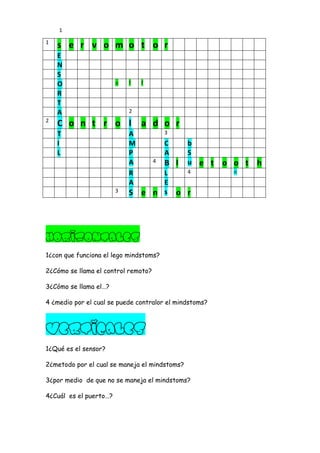 El documento habla sobre las partes principales de Lego Mindstorms y cómo funciona. Mindstorms usa servomotores, sensores y un controlador para moverse. Se controla de forma inalámbrica a través de Bluetooth usando un control remoto. Los sensores detectan el entorno para ayudar a la navegación.
