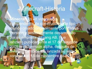 Minecraft es un popular videojuego de construcción independiente creado por Markus Persson que permite a los jugadores construir casi cualquier cosa en un mundo digital. Los jugadores pueden explorar en los modos de supervivencia o creativo, y visitar otras dimensiones como Nether y The End. El juego ha vendido más de 200 millones de copias desde su lanzamiento en 2009.