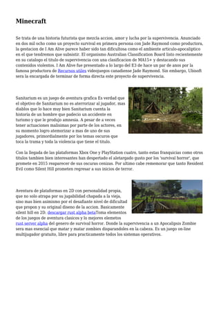 El documento describe varios videojuegos, centrándose en títulos de supervivencia y horror, como 'I Am Alive', 'Sanitarium', y 'Silent Hill', mencionando sus características y desarrollo. También se discute el resurgimiento de estos géneros con el avance de las nuevas plataformas de juegos en 2015. Además, se hace referencia a 'Rust' y 'H1Z1' como ejemplos de juegos online multijugador en el ámbito de la supervivencia.