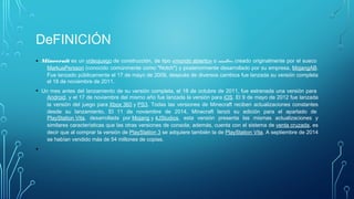 Minecraft es un videojuego de construcción y supervivencia desarrollado por Mojang. Los jugadores interactúan con un mundo generado proceduralmente donde deben recolectar recursos, construir estructuras y defenderse de enemigos. El juego cuenta con varios modos como supervivencia, creativo y aventura.