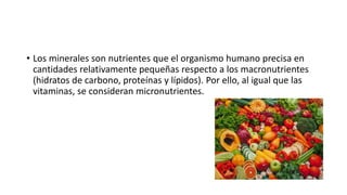 Los minerales son micronutrientes esenciales que el cuerpo humano necesita en pequeñas cantidades y que no pueden ser sintetizados. Se clasifican en macroelementos, microelementos y elementos traza esenciales, dependiendo de la cantidad necesaria diaria. Representan entre el 4-5% del peso corporal y se encuentran ampliamente en los alimentos aunque su contenido puede variar. Algunos alimentos contienen antinutrientes que dificultan la absorción de minerales. Las deficiencias de hierro y yodo son las más com