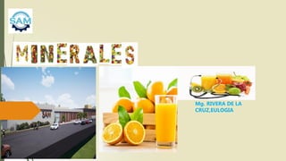 El documento describe los principales minerales que forman parte de la dieta humana, incluyendo calcio, fósforo, magnesio, hierro, yodo, cinc, selenio, sodio y potasio. Explica dónde se encuentran estos minerales en el cuerpo, sus funciones, fuentes alimenticias y posibles deficiencias o efectos de un exceso.