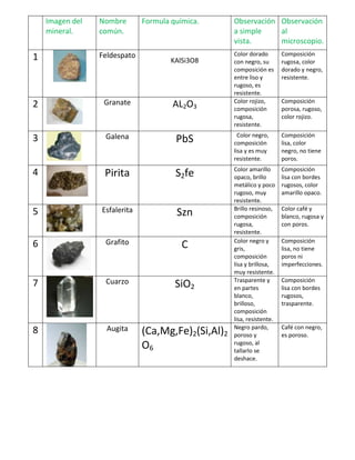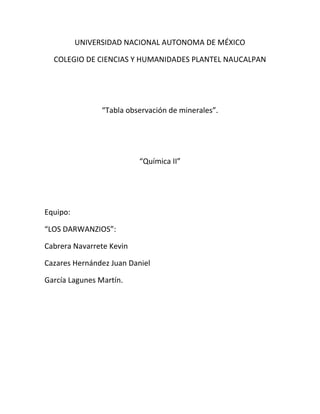 El documento presenta una tabla de observación de 8 minerales realizada por el equipo "LOS DARWANZIOS" para su clase de Química II. La tabla incluye la imagen, nombre común, fórmula química de cada mineral y observaciones a simple vista y al microscopio de su color, composición, textura y resistencia. Los minerales estudiados fueron: feldespato, granate, galena, pirita, esfalerita, grafito, cuarzo y augita.