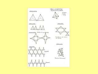 El documento describe diferentes tipos de minerales, clasificados en cinco clases. La Clase I incluye elementos nativos como el azufre, cobre y diamante. La Clase II son sulfuros como la pirita y galena. La Clase III incluye haluros como la halita. La Clase IV son óxidos e hidróxidos como la hematita. Finalmente, la Clase V son carbonatos como la calcita. Cada mineral se describe brevemente por su fórmula, estructura cristalina, propiedades y usos.