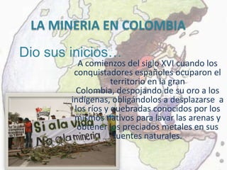 La minería en Colombia ha existido desde la época de la conquista española, cuando los conquistadores obligaron a los indígenas a extraer oro de los ríos. Aunque la minería genera riquezas, también tiene un gran impacto ambiental y aproximadamente 15,000 familias dependen de la minería legal e ilegal. El tema de la minería en Colombia es importante debido a su impacto económico, ambiental y laboral a través de los siglos, y porque muchas familias se sustentan de la minería.