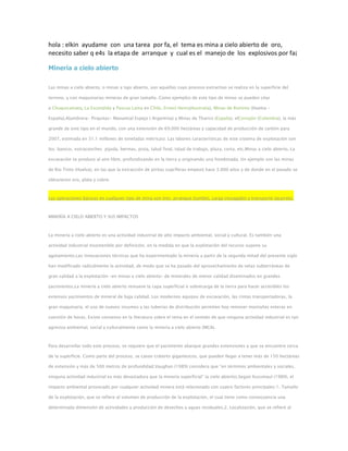 La minería a cielo abierto implica la excavación de grandes áreas en la superficie terrestre utilizando maquinaria pesada para extraer minerales. Tiene un alto impacto ambiental, social y paisajístico, incluyendo la contaminación del agua y el aire, la destrucción de hábitats y comunidades, y la formación de grandes cráteres después de la explotación. Algunos de los mayores impactos son la remoción de la capa superior del suelo, la contaminación de las aguas superficiales y subterráne