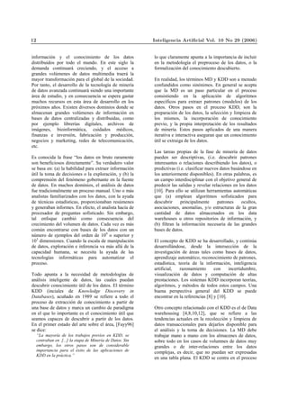 Este documento presenta una introducción a la minería de datos, incluyendo su definición, las tareas involucradas, las técnicas utilizadas y las tendencias actuales. Explica que la minería de datos es un paso clave en el proceso más amplio de descubrimiento de conocimiento en bases de datos, y tiene como objetivo extraer patrones y conocimiento útil de grandes volúmenes de datos heterogéneos mediante el uso de algoritmos automatizados.