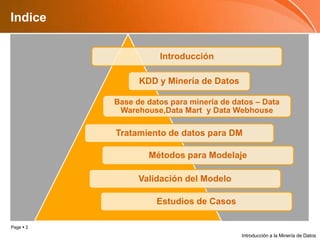 El documento presenta una introducción a la minería de datos, incluyendo un índice y enlaces a recursos adicionales como un blog y libro de texto sobre el tema. Se enfoca principalmente en métodos para el modelado de datos.