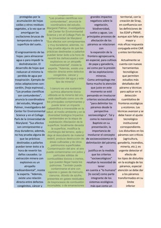 El documento discute los efectos negativos de la minería en los páramos colombianos, ecosistemas frágiles que proveen el 70% del agua del país. A pesar de la prohibición legal de realizar minería en los páramos, se han otorgado 391 títulos mineros en 108,972 hectáreas de páramo, poniendo en alto riesgo 22 páramos. La minería con explosivos causa daños ambientales omnipresentes y duraderos, como contaminación del agua y afectación a la biodivers