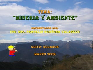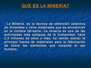 Este documento resume la minería y su impacto ambiental. Explica que la minería es una de las actividades humanas más antiguas y que extrae minerales de la corteza terrestre para fabricar elementos. Luego describe las diferentes etapas de la minería como la exploración, explotación, beneficio y fundición. También analiza los posibles impactos ambientales de la minería y las medidas para prevenirlos y mitigarlos. Finalmente, enfatiza la importancia de la responsabilidad social de las empresas mineras y el trabajo conjunto entre las comunidades,