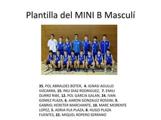Este documento presenta las plantillas de los equipos masculinos MINI B y MINI A. La plantilla del MINI B incluye 15 jugadores con sus respectivos números, mientras que la plantilla del MINI A incluye 12 jugadores con sus números.
