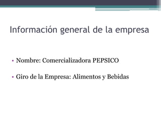 La empresa PEPSICO busca ofrecer alimentos y bebidas al mismo tiempo que genera oportunidades de crecimiento. Implementó el sistema DLX para automatizar los inventarios con el fin de aumentar la precisión, productividad y velocidad en los almacenes. Los empleados fueron capacitados y ahora el sistema permite realizar un inventario en tiempo real y mejorar los procesos.