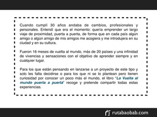 El documento narra la experiencia de un viaje alrededor del mundo de 16 meses y más de 20 países, con el objetivo de aprender de cada cultura y destino. Incluye recomendaciones de alojamientos y actividades en diversos países como Brasil, Argentina, Chile, Bolivia, Perú, Estados Unidos, Nueva Zelanda y Australia. Además, se ofrece una mini guía rápida con consejos y notas útiles para los viajeros interesados en estos destinos.