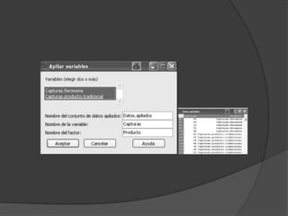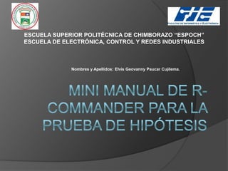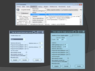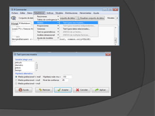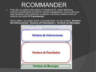 Este documento presenta una breve introducción al entorno R Commander, el cual se divide en tres ventanas principales: la Ventana de Instrucciones, la Ventana de Resultados y la Ventana de Mensajes. También describe los elementos del menú de R Commander, incluyendo opciones para gestionar datos, realizar análisis estadísticos, gráficos y modelos. Por último, explica cómo introducir y almacenar datos en R Commander.