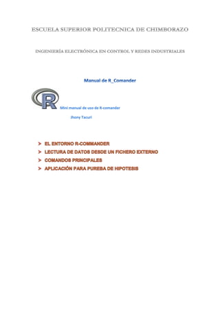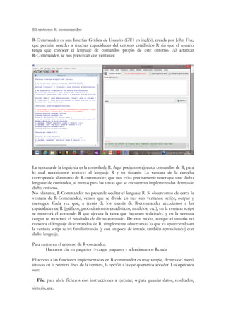 R-Commander es una interfaz gráfica de usuario creada por John Fox que permite acceder a las capacidades del entorno estadístico R sin necesidad de conocer su lenguaje de comandos. Proporciona menús para tareas estadísticas, gráficos, modelos y más, mostrando los comandos R subyacentes y resultados. Esto permite familiarizarse con el lenguaje R sin usar comandos directamente.