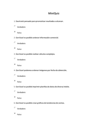 El documento contiene una serie de minijuegos de preguntas y respuestas sobre las funcionalidades de Excel. Las preguntas cubren temas como el uso de fórmulas, funciones, formato de celdas, ordenamiento y filtrado de datos, y referencias absolutas y relativas al copiar celdas.