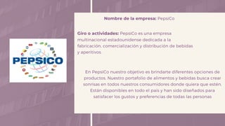 PepsiCo es una empresa multinacional dedicada a la fabricación y distribución de bebidas y aperitivos. Su objetivo es brindar diferentes opciones de alimentos y bebidas para crear sonrisas en los consumidores. Implementó un nuevo sistema WMS en su centro de distribución para aumentar la productividad, mejorar la exactitud y reducir costos en las operaciones de almacenamiento y despacho.