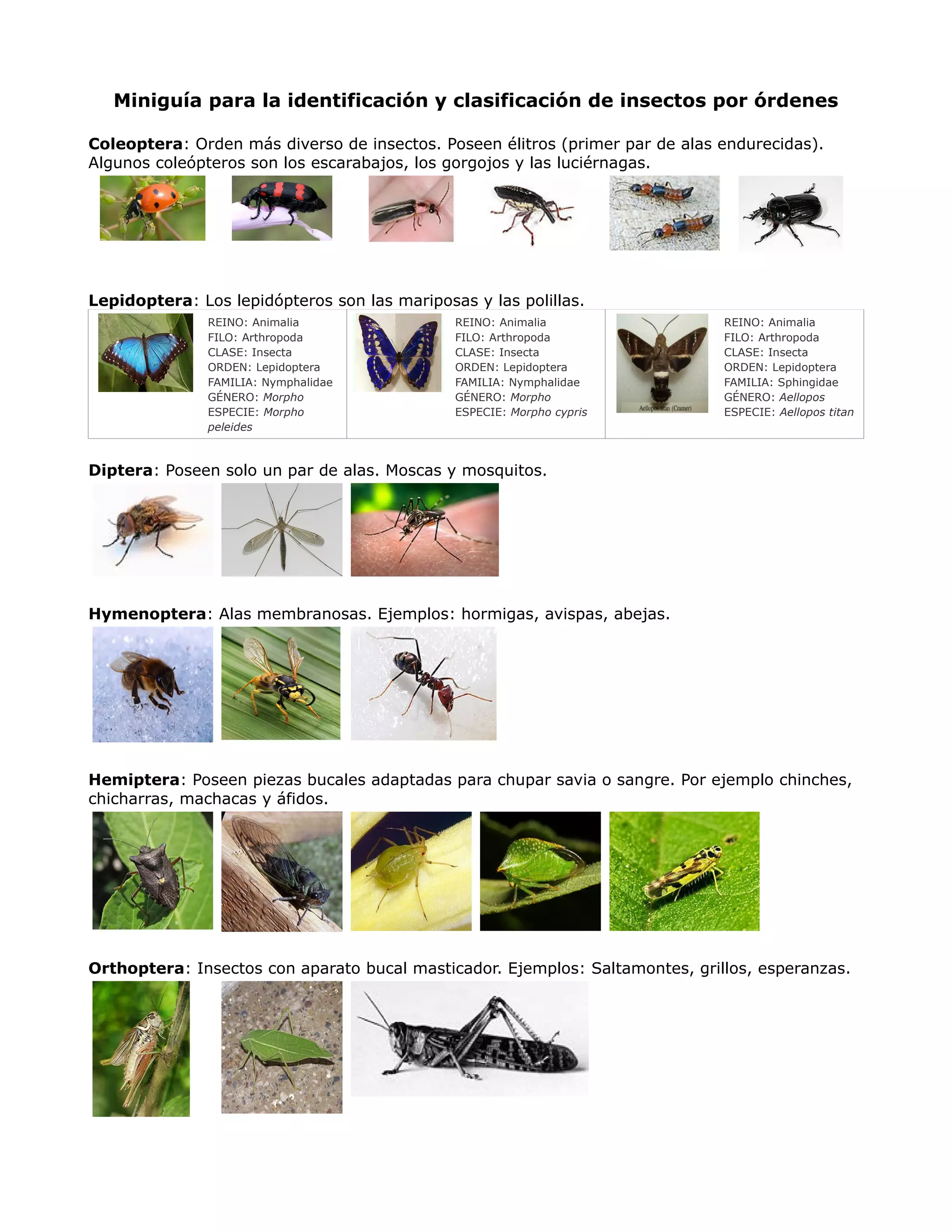 La miniguía proporciona una clasificación de insectos por órdenes, destacando que los coleópteros son el grupo más diverso y poseen élitros. Se describen otros órdenes como lepidóptera (mariposas y polillas), diptera (moscas y mosquitos), hymenoptera (hormigas y abejas) y hemiptera (chinches). También se mencionan órdenes menores como odonata (libélulas) y blattodea (cucarachas), entre otros.