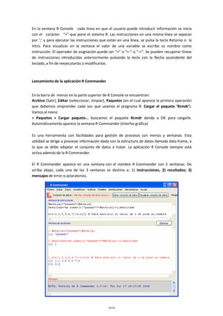 Este documento describe el software estadístico R y su interfaz gráfica R Commander. R es un entorno de trabajo orientado a resolver problemas de estadística que permite trabajar de forma interactiva o mediante programación. R Commander ofrece menús y ventanas para importar, explorar y analizar datos de forma gráfica. El documento explica cómo cargar paquetes, importar datos, realizar cálculos estadísticos y modelización, y utilizar comandos y funciones básicas de R.
