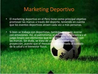 El marketing deportivo en el Perú tiene como objetivo principal promover las marcas a través del deporte, aprovechando que los eventos deportivos atraen a más personas. Se puede asociar marcas con emociones como el patriotismo y el esfuerzo relacionados con el deporte. El marketing deportivo analiza los deseos y necesidades de los consumidores de deporte a través de procesos de intercambio, con el objetivo de comercializar productos y servicios deportivos, así como promocionar otras marcas a través del deporte.