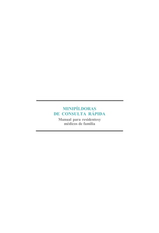 Este documento parece ser un manual de consulta rápida para residentes y médicos de familia que incluye resúmenes breves sobre una amplia gama de temas médicos. Contiene secciones sobre patología general, miscelánea, oftalmología, otorrinolaringología, neurología, cardiología, neumología, digestivo, trastornos hidroelectrolíticos, nefro-urología, ginecología y obstetricia, endocrinología, reumatología, traumatología, patología vascular, der