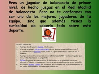 El documento habla sobre el juego de baloncesto. Se pide al lector que investigue sobre el origen del baloncesto, el juego del que proviene, sus primeras reglas e inventores. También se solicita información sobre los máximos anotadores históricos de la NBA y características de los equipos actuales como número de jugadores y cambios en las reglas desde sus inicios.