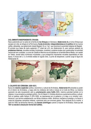 Al Andalus se refiere al dominio musulmán en la Península Ibérica durante la Edad Media, que duró casi 8 siglos. Sus principales etapas fueron: 1) el Emirato dependiente de Damasco (714-756), 2) el Emirato independiente de Córdoba (756-929), 3) el esplendoroso Califato de Córdoba (929-1031), 4) el periodo de fragmentación en múltiples reinos taifas (1031-1090), 5) la unificación almorávide (1090-1145), 6)