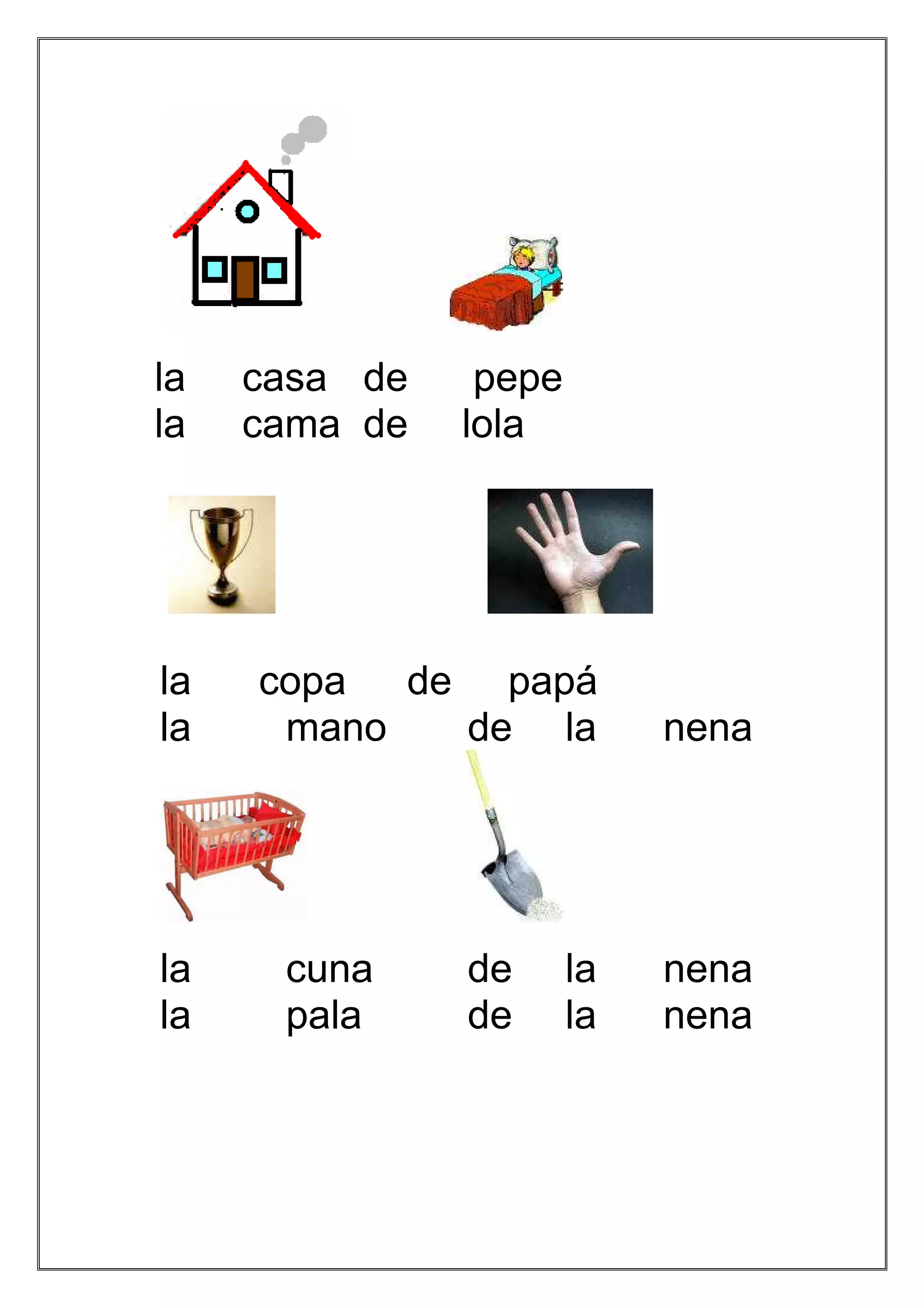 El documento contiene varias oraciones cortas que describen objetos y su ubicación o dueño. Se mencionan cosas como la casa, la cama, la copa, la mano, la cuna y sus dueños o ubicaciones. También se describen acciones de personas y animales como el lobo comiendo al conejo, el gato comiendo a la rata y el papá pegándole al lobo.