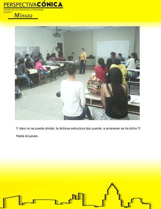 El martes 27 de septiembre la clase comenzó a las 9:30am en el salón de usos múltiples. La profesora habló sobre varios profesores, destacando a Eduardo Lozano, quien hizo que el material denso de estructura fuese más fácil de entender. Para el jueves, los estudiantes deben entregar el planteamiento del problema de su prototipo tridimensional en vector activo, explicando qué es el problema planteado, qué es una estructura de vector activo y sus partes, elementos, funciones y