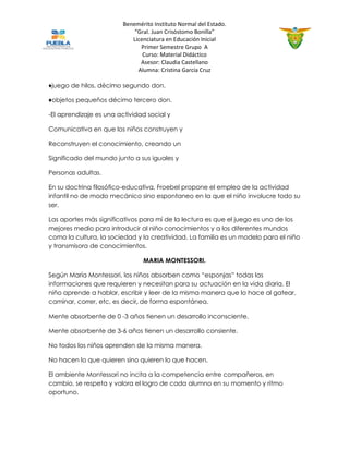 El documento resume las propuestas pedagógicas de Federico Froebel, María Montessori y Zoltan Dienes. Froebel propuso que el juego es el mejor método para introducir a los niños al mundo, y desarrolló los jardines infantiles. Montessori creía que los niños aprenden de forma espontánea a través de su entorno, y desarrolló el método Montessori. Dienes describió seis etapas del aprendizaje matemático, comenzando con la adaptación a través de juegos y terminando con la formal