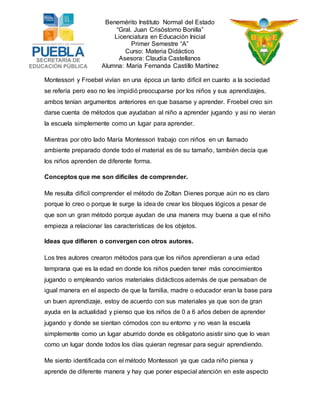 El documento resume los principios fundamentales de María Montessori, Federico Froebel y Zoltan Dienes con respecto al material didáctico y la educación de niños pequeños. Montessori creía que los niños aprenden absorbiendo información de su entorno, Froebel pensaba que la familia era fundamental para la transmisión de conocimientos, y Dienes creó los bloques lógicos para ayudar a los niños a desarrollar sus habilidades. Aunque tenían ideas diferentes, todos buscaban que los niños aprendieran mejor desde una edad temprana