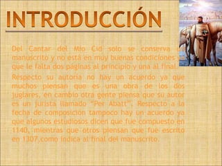 El documento resume el argumento del Cantar del Mio Cid. Explica que solo se conserva un manuscrito incompleto de la obra y que no hay consenso sobre su autoría o fecha de composición. Narra la vida de Rodrigo Díaz de Vivar desde su destierro de Castilla hasta su victoria sobre los moros y la afrenta y venganza posterior sobre los Infantes de Carrión.