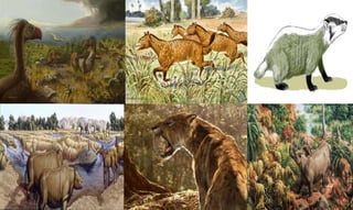 El documento describe la era geológica del Mioceno, que ocurrió hace entre 23-5 millones de años como parte de la era Cenozoica. El Mioceno presenció la formación de montañas, el descenso de temperaturas globales, y la expansión y diversificación de plantas y animales modernos como caballos, rinocerontes y simios por todo el mundo.
