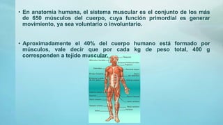 El documento describe la estructura y tipos de músculos en el cuerpo humano. Explica que hay aproximadamente 650 músculos que componen el 40% del peso corporal y generan movimiento voluntario e involuntario. Describe tres tipos principales de músculos: esquelético, liso y cardíaco. El músculo esquelético se compone de fibras musculares y tendones y permite el movimiento del esqueleto de forma voluntaria, mientras que el músculo liso se encuentra en órganos internos y vas