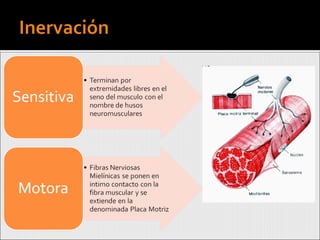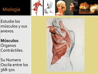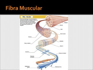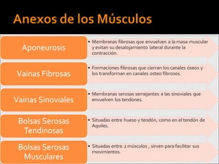 Este documento resume las características generales de los músculos. Los músculos son órganos contráctiles que se fijan a los huesos u otras estructuras por medio de tendones. Están compuestos por fascículos musculares envueltos en tejido conjuntivo. Cada músculo posee una rica vascularización que proporciona nutrientes y oxígeno a sus fibras musculares. El documento también enumera los principales grupos musculares del cuerpo humano.