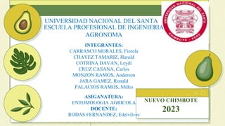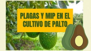 Este documento resume un proyecto de investigación sobre plagas y Manejo Integrado de Plagas (MIP) en el cultivo de palto. Identifica varias plagas importantes como el pegador del palto, el medidor pardo, el bicho del cesto, la mosca blanca y el chinche verde. Describe el ciclo de vida, daños y controles culturales, biológicos y químicos para cada plaga. El objetivo general es investigar plagas y aplicar MIP para mejorar la calidad de la producción de palto minimizando el da