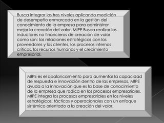 El documento describe un modelo llamado MIPE que busca integrar los niveles estratégicos, tácticos y operacionales de una empresa aplicando mediciones de desempeño para administrar mejor la creación de valor. MIPE también busca medir inductores no financieros como las relaciones con clientes y proveedores, procesos internos críticos y el crecimiento empresarial. El modelo propone cuatro fases: gestión del conocimiento, mapa estratégico, nivel táctico para toma de decisiones y nivel transaccional.