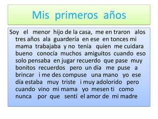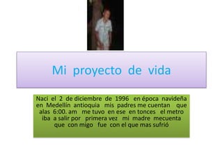 Este documento resume la vida del autor desde su nacimiento en Medellín, Colombia en 1996 hasta su actualidad cursando el grado noveno. Describe sus primeros años en la guardería donde hizo amigos y tuvo una lesión en la mano. A los 6 años entró a la escuela primaria donde aprendió a sumar y conocer nuevas personas que compartían sus pensamientos. Actualmente, el autor está ansioso por graduarse de la escuela secundaria e ingresar a la universidad para estudiar la carrera de sus sueños.