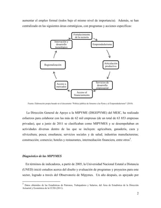 El documento describe el panorama de las micro, pequeñas y medianas empresas (MIPYMES) en Costa Rica. Resume que las MIPYMES representan aproximadamente el 98% de las empresas en el país y contribuyen significativamente a la economía a través de la generación de empleos y producción. Sin embargo, las MIPYMES enfrentan restricciones como trámites excesivos, bajo uso de tecnología e innovación, y capacidad administrativa débil. Propone la creación de una planificación estratégica para las MIPYMES que involucre a