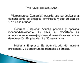 El documento describe tres tipos de empresas: microempresas, pequeñas empresas y medianas empresas. Microempresas tienen de 1 a 10 empleados y se dedican a la compra-venta de artículos. Pequeñas empresas tienen de 11 a 30 empleados y son independientes. Medianas empresas son administradas profesionalmente y tienen un amplio alcance de mercado. Todas estas empresas juegan un papel importante en el desarrollo económico al crear empleos y satisfacer las demandas de los consumidores.