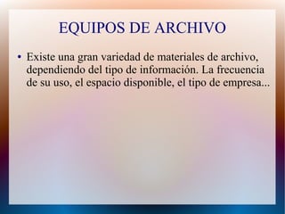 Este documento describe los diferentes materiales y equipos utilizados para archivar documentos, incluyendo cajas de archivo, archivadores, bandejas, carpetas, fichas, guías, estanterías abiertas, armarios de oficina, archivadores con cajones, armarios móviles y armarios giratorios. Explica el propósito y uso de cada uno de estos elementos para organizar y almacenar documentos de manera eficiente.